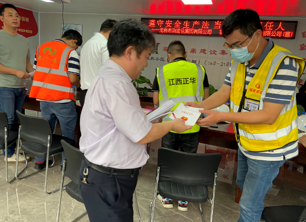 現(xiàn)場徐旺興董事長、修海金副總經(jīng)理分別向項目部人員及工人現(xiàn)場分發(fā)《安全生產(chǎn)法》及“五進”等宣傳資料。